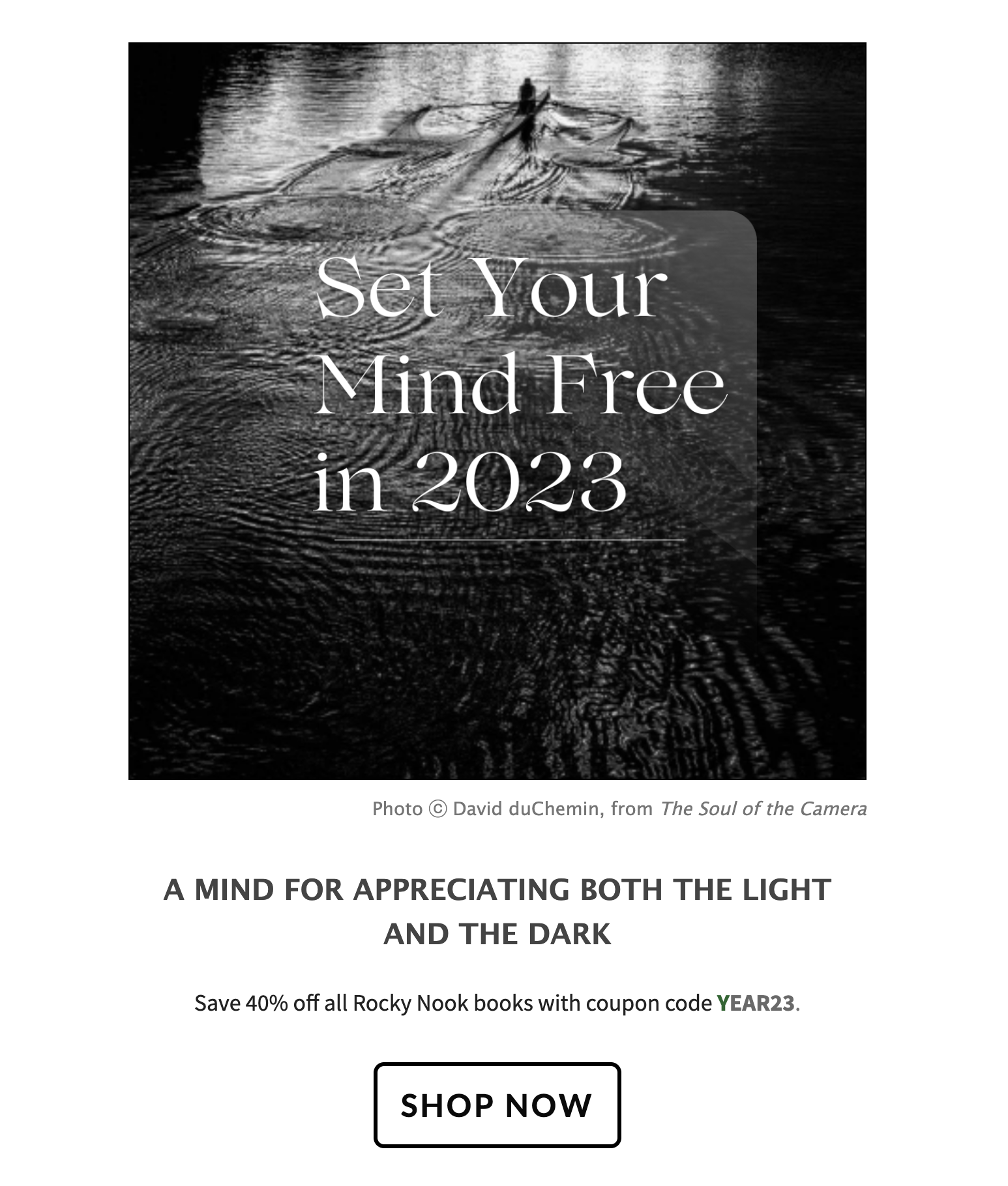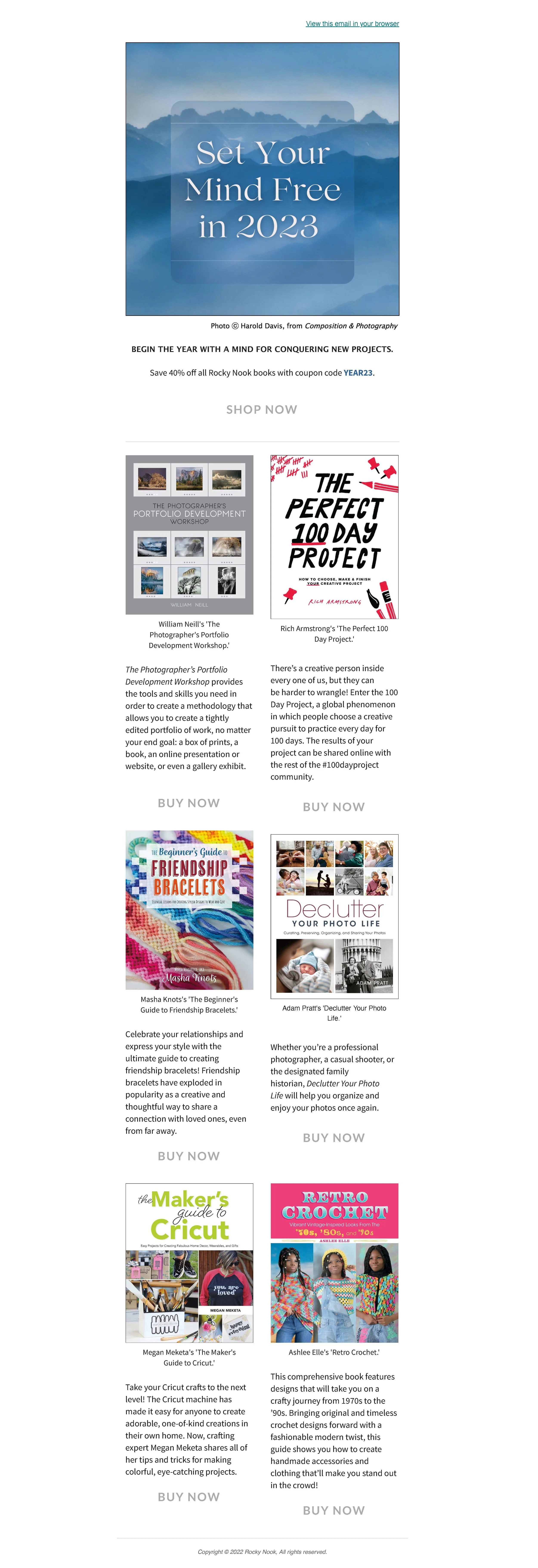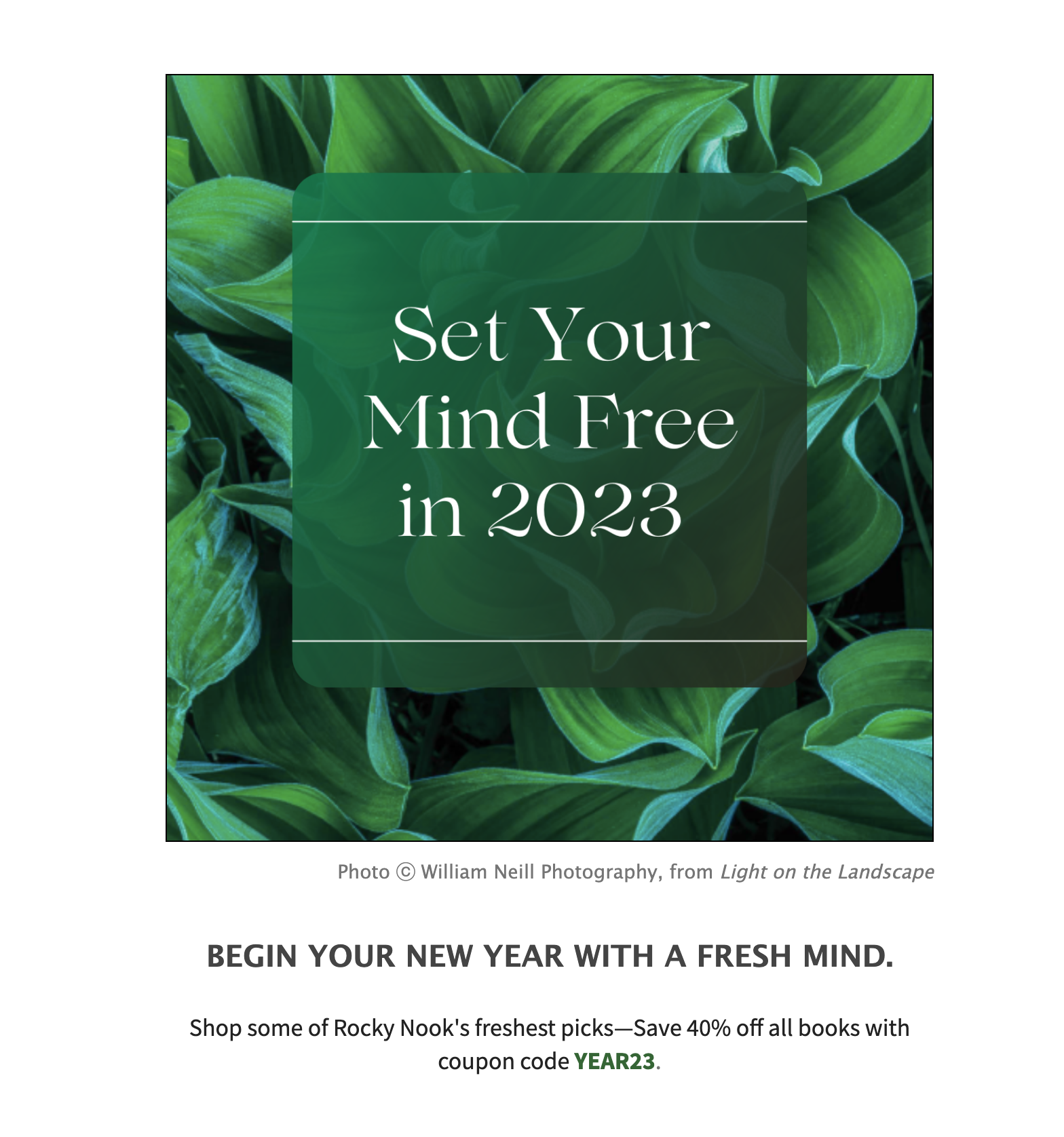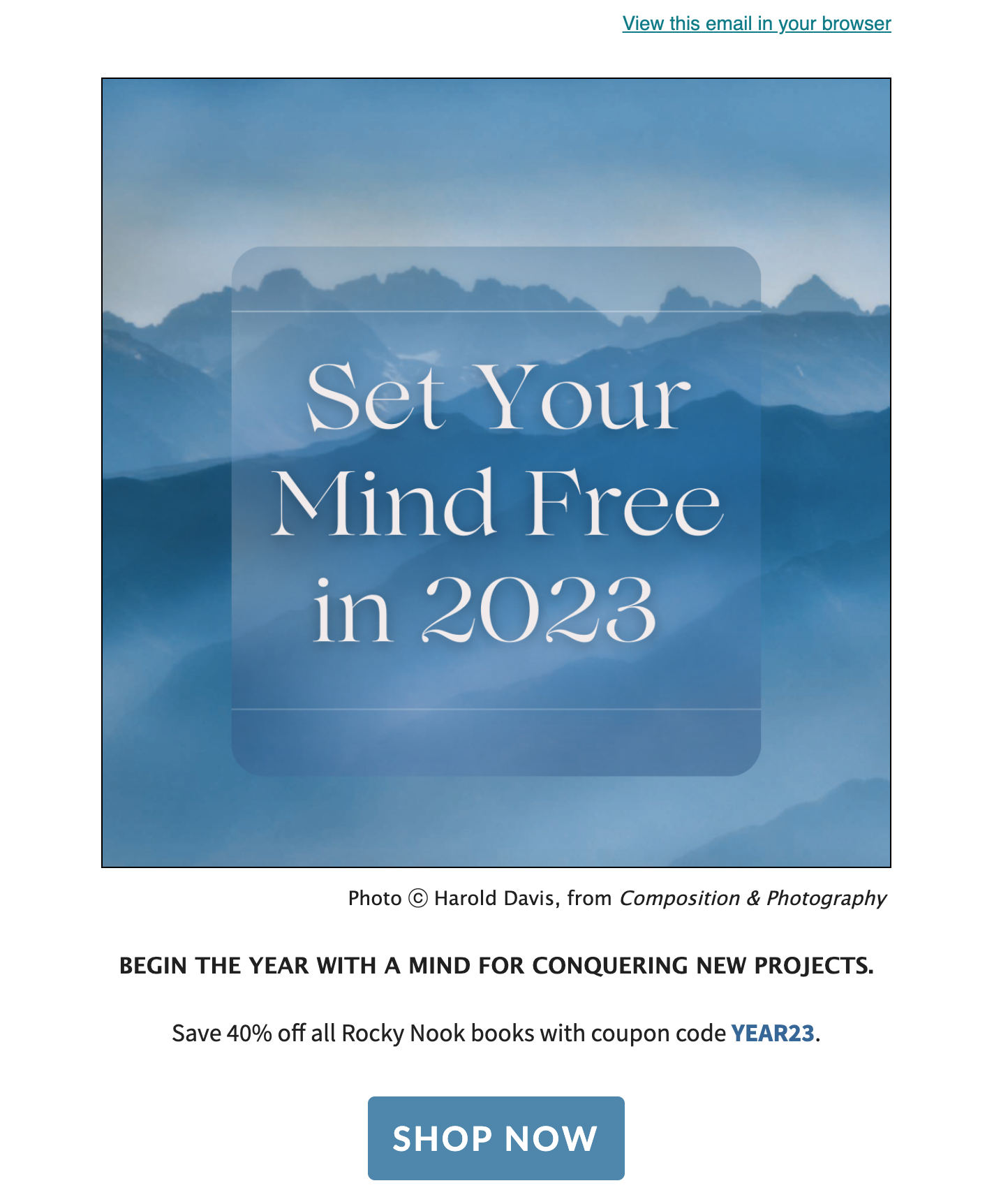 OVERVIEW: Rocky Nook maintains a primary newsletter list of 30K subscribers. This is the email campaign and suite of 6 emails sent during the period of Dec. 22, 2022 through Jan. 1, 2022. The theme, Set Your Mind Free in 2023, was on mind/body/spirit renewal and rejuvenation. Sub-themes, as depicted by each of the emails, were: 1.) adopting a fresh mindset, 2.) adventures we undertake on our own, 3.) releasing our inner critic, 4.) committing to long-term projects, 5.) seeing both sides of the spectrum, and 6.) honing and prioritizing our goals.