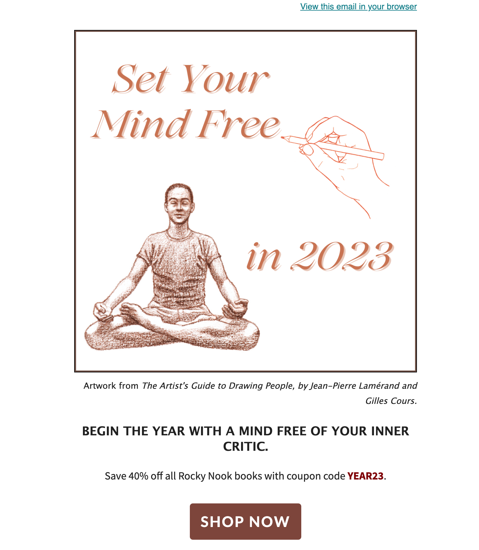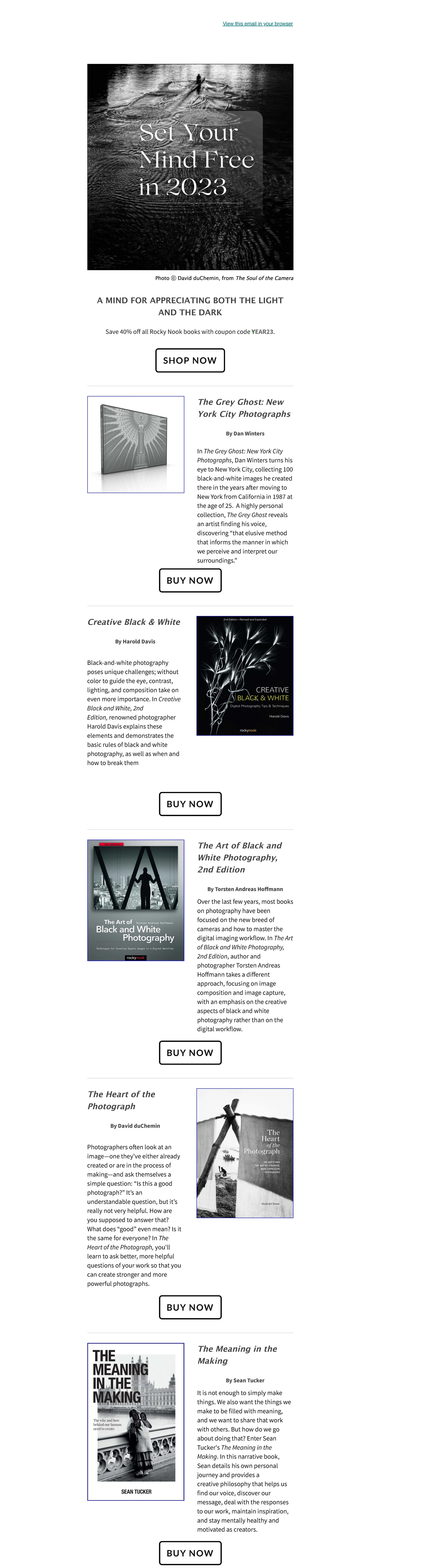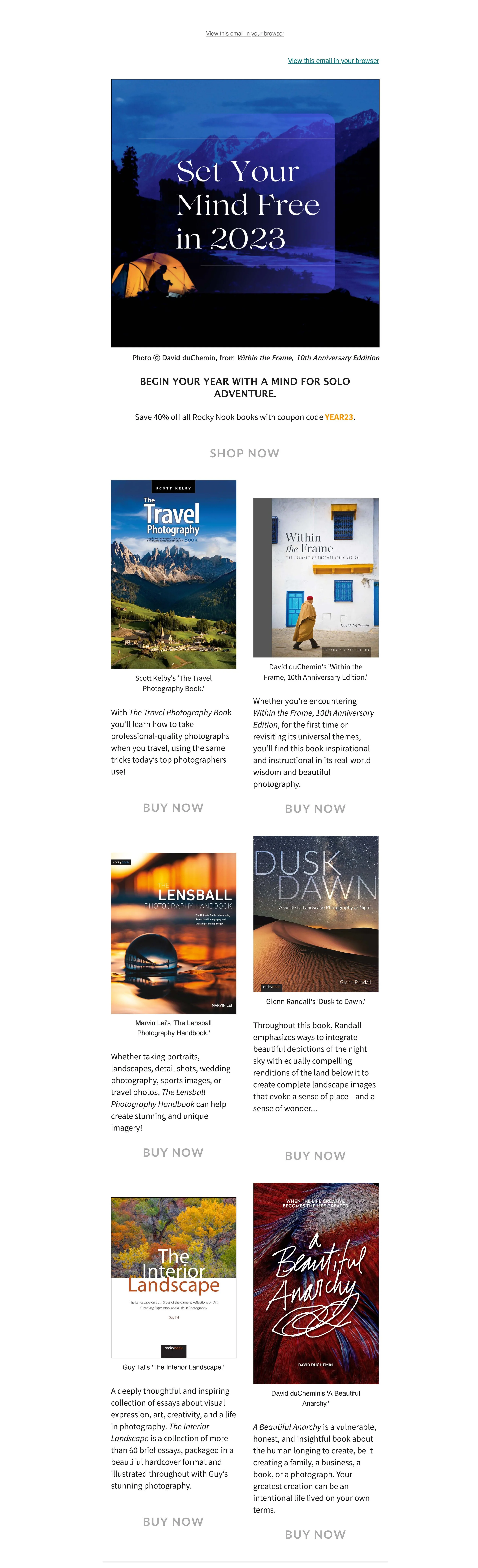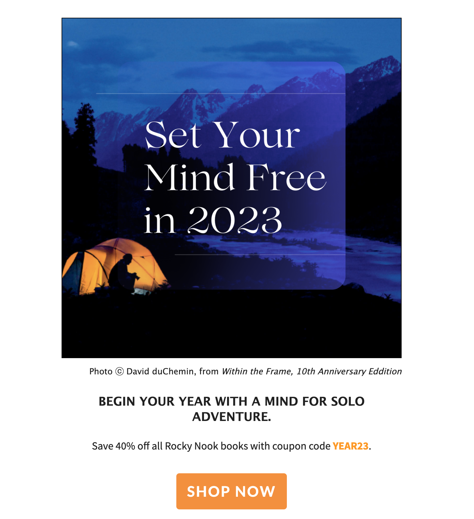 OVERVIEW: Rocky Nook maintains a primary newsletter list of 30K subscribers. This is the email campaign and suite of 6 emails sent during the period of Dec. 22, 2022 through Jan. 1, 2022. The theme, Set Your Mind Free in 2023, was on mind/body/spirit renewal and rejuvenation. Sub-themes, as depicted by each of the emails, were: 1.) adopting a fresh mindset, 2.) adventures we undertake on our own, 3.) releasing our inner critic, 4.) committing to long-term projects, 5.) seeing both sides of the spectrum, and 6.) honing and prioritizing our goals.
