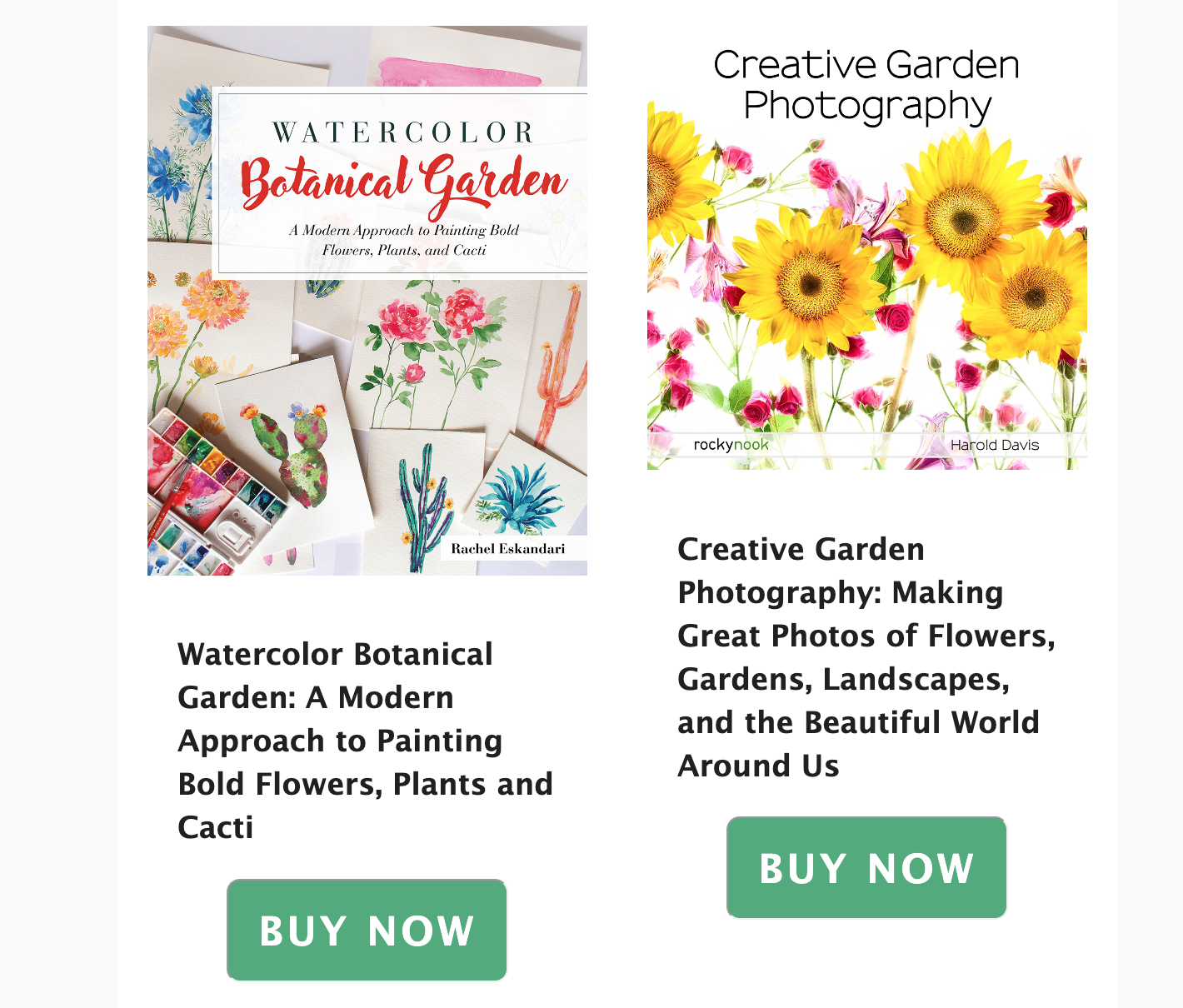 WHY/HOW: Rocky Nook has a growing list of topics of publishing topics, including drawing, painting, crafting, and general creativity. For this short campaign, I selected three primary books to feature across both emails that reflected the theme of desert/cactus photography and painting. At the bottom of each email I anchored Rocky Nook’s free resource giveaway: a tutorial on painting a varietal of cactus. With the three themed books, and the free project in each email, I had more room to include broader topics that were less related to desert photography.