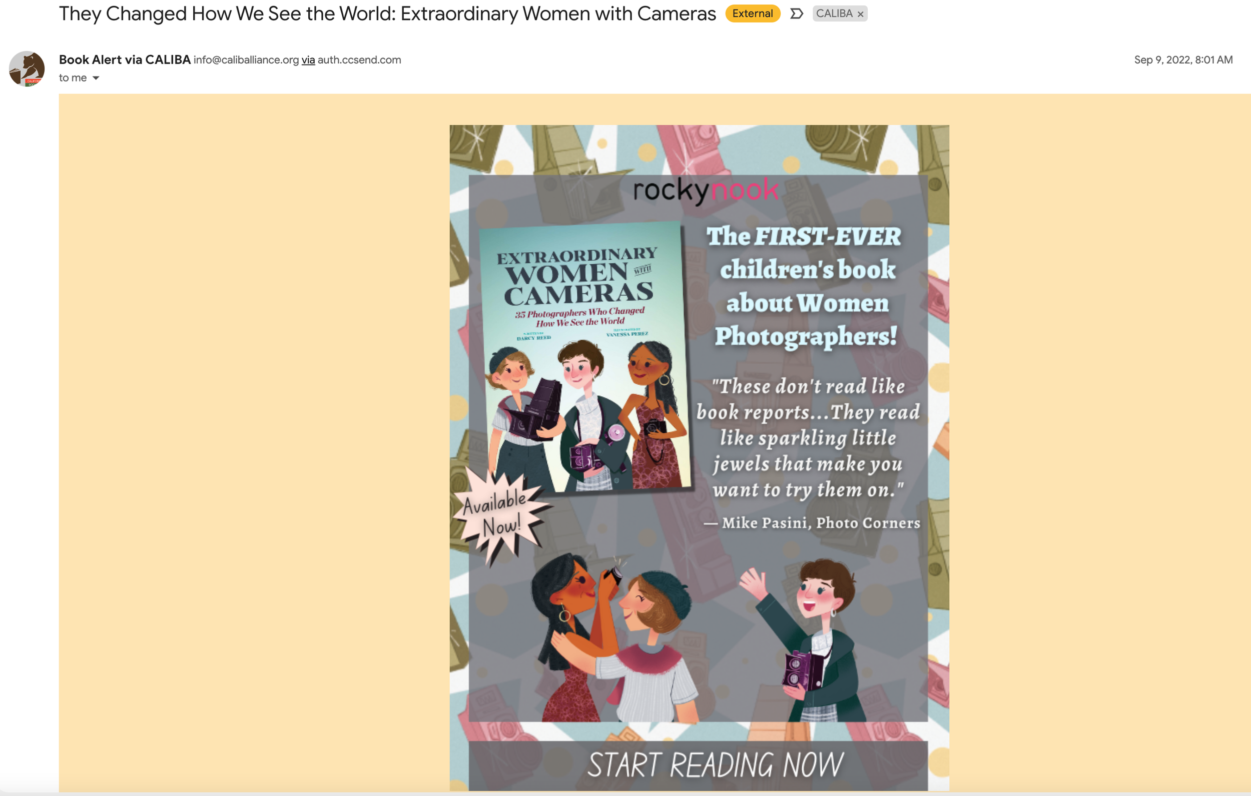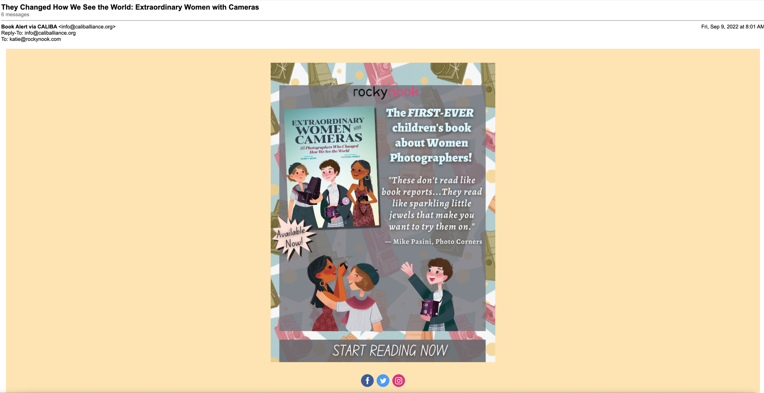 This campaign was strategically planned before CALIBA’s annual Fall Fest, which was taking place the weekend of 09/09/2022. Rocky Nook is distributed, sold, and represented by Ingram Content Group, who would be at Fall Fest 2022 representing Rocky Nook among its other publisher accounts. I strategically targeted this eBlast that booksellers would see online before attending Fall Fest and seeing the book on display in person to encourage product familiarity and increase talking points for the Ingram sales representatives.
